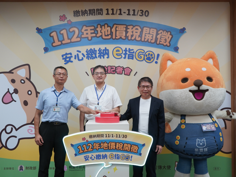 圖說:財政部賦稅署稽徵行政組組長賴基福 (由左至右)、財政部賦稅署財產稅組組長吳君泰、桃園市政府地方稅務局局長姚世昌、宣導大使柴語錄,一同啟動112年地價稅開徵按鈕!
