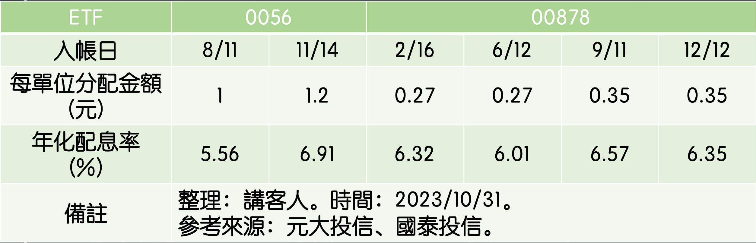 再看到0056,今年首度改成季配息,但認真說,他們是下半年才調整配息方式,所以全年也只配發兩次,「兩次配息」等於是一年份了,全年配發2.2元,年化報酬率則從第三季5.56%上升到第四季的6.91%。