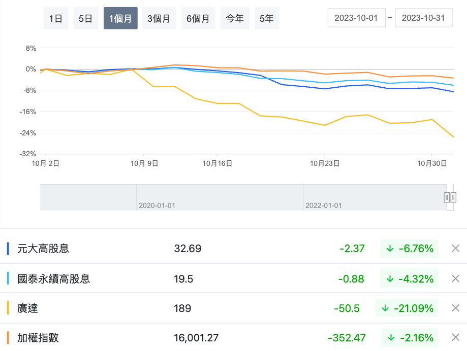 2023年已經來到尾聲,一年已經過了十個月,年初的0056、00878也沒人料想得到,五月份一個AI大風就把這兩檔ETF吹了起來,廣達直接飆漲161.41%,0056累計漲幅繳出近三成的28.7%,00878也有近兩成的20.59%,相對於加權指數13.18%,可說是直接海放台股平均值。但其實AI族群也不是一路順風,前陣子廣達才剛衝上240%以上的漲幅,最新收盤則收斂到161.41%,消風接近一倍的漲幅,這當然是「成也AI、敗也AI」。反過來說,最近AI族群開始逆風,那麼原本跟著吃香喝辣的兩檔「56」、「78」當然也得跟著收斂一些,但如果接下來繼續殺AI,那麼你就要注意兩檔AI概念ETF的抗跌性了,才不會年初賺翻卻在年底吐光,虎頭蛇尾的績效可不妙,這兩檔AI概念ETF的近況又是如何?我打算用三個重點馬上告訴你。