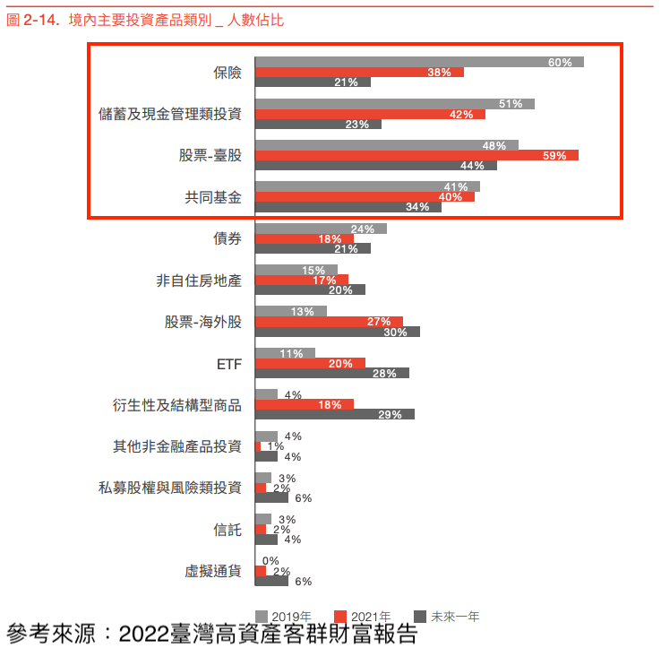 你會不會很好奇那些高資產族都投資什麼?其實這份報告也幫大家統計出來了,以2021年投資項目的前四名來看,分別是台股59%、儲蓄42%、共同基金40%、保險38%,顯而易見,這些有錢人也是都投資股票為主,至於儲蓄、保險本來就是人人必須有,而共同基金就是投信在賣的那些基金,但以前基金行情好可不代表現在還是這麼強,或許這也是台股投資逼近六成的主因吧?