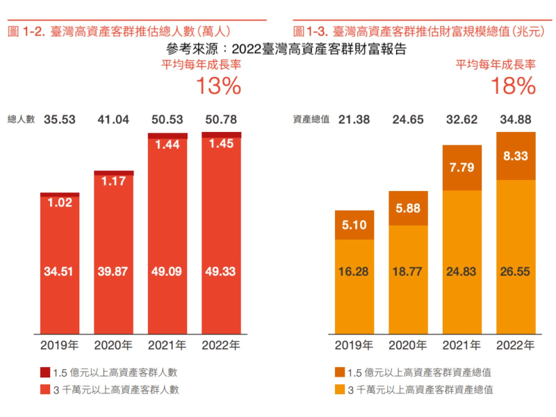 報告又把這些人分成兩類,一種是三千萬以上的高資產族,另外一種是更頂級的1.5億以上,疫情前的台灣高資產族總人數差不多35.53萬人,來到2022年竟然成長到50.78萬人,擁有三千萬以上的高資產族更增加15萬人左右,年化成長率是13%。