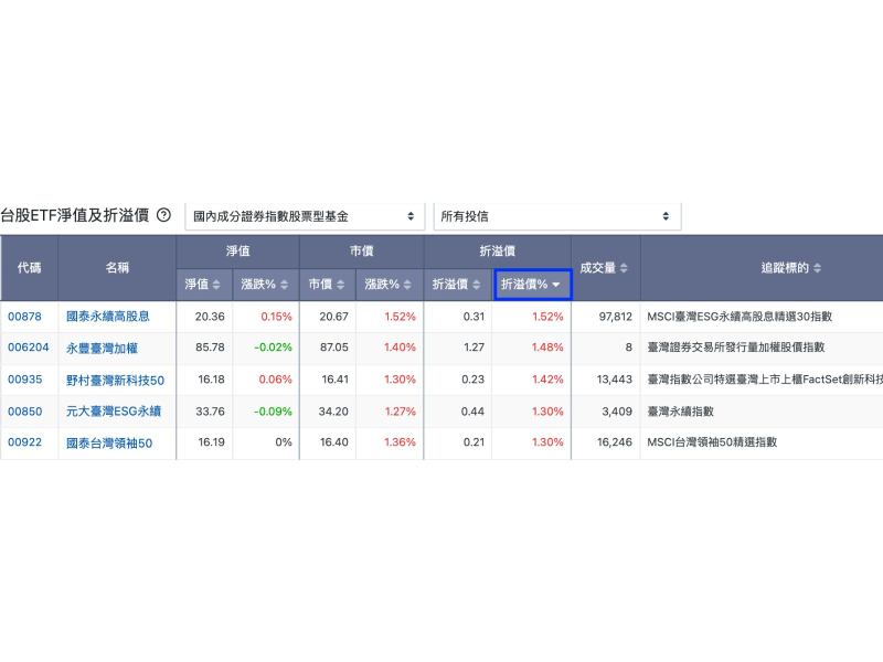 當我們買ETF時,就要注意折、溢價,最好都能買到折價,就好比投資個股要買便宜一點,像是價值投資不買貴,如果買到溢價倒也不是不行,但你必須要確定ETF有機會繼續上漲,這就如同買進成長股,現在雖然是買貴了,但未來的成分股或操盤還能上漲,那麼之後還是能賺到價差。