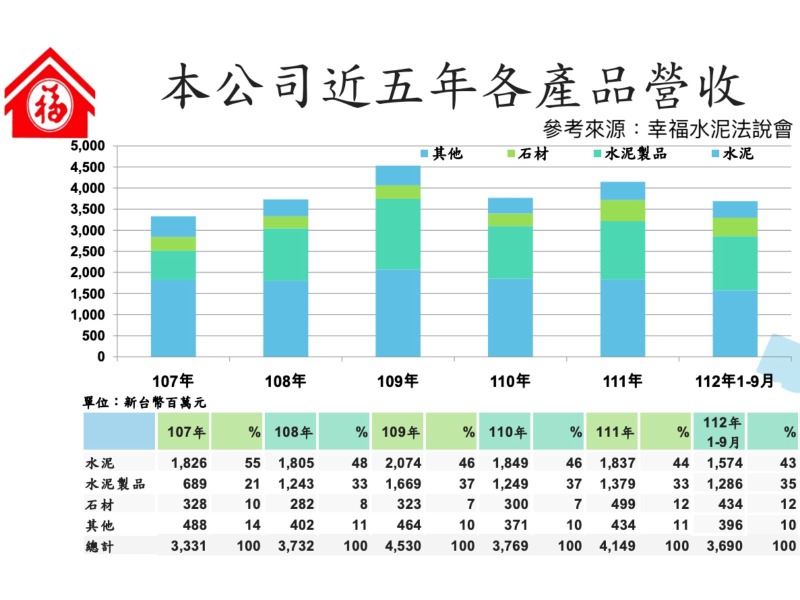首先第一家是幸福,這名字取的好,在台灣如何找幸福?有家最幸福,所以幸福就來賣水泥,讓大家蓋房子無虞,賣幸福給大家。好啦前面是閒聊,不是重點,認真來說,幸福正是不動產供應鏈的受惠族群,最近建商又開始蓋新房,所以需求當然又拉起來了,從最新公布的營收來看,2023年前11月繳出46.45億、年增24.5%,並創下歷史同期次高的成績。最猛的是在2020年全年繳出45.3億,那一年正是房市大爆發,如果這樣看起來,其實2023年的房市景氣也才稍微回溫而已,結果前11月已經超越2020年,全年有機會衝上50億大關,上次營收有這個能耐的時間點是2015年,你就知道這次有多猛了。所以小資族沒錢買房,但房價又一直高漲,其實投資這種水泥公司也等於間接能受惠。