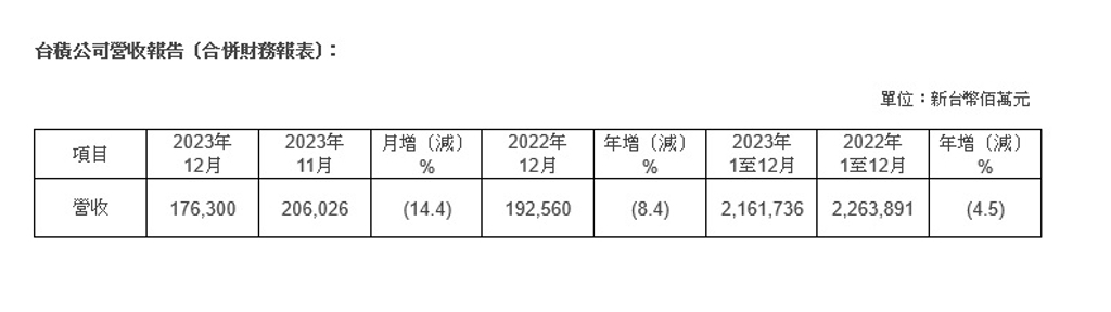 晶圓代工領導廠台積電(2330)10日公布2023年12月合併營收為1,763 億元,較去年11月減少14.4%,相較2022年同期減少8.4%。累計2023年合併營收約為新台幣 2 兆 1,617億3,600萬元,較2022年減少4.5%。
