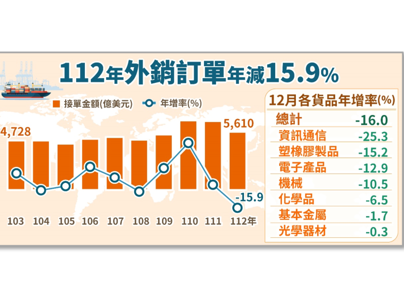 經濟部公布12月及全年外銷訂單統計,受通膨與升息效應、終端需求疲弱及產業調整庫存影響,12月外銷訂單翻黑,訂單總額減少至438.1億美元,月減13.5%,全年減少15.9%。