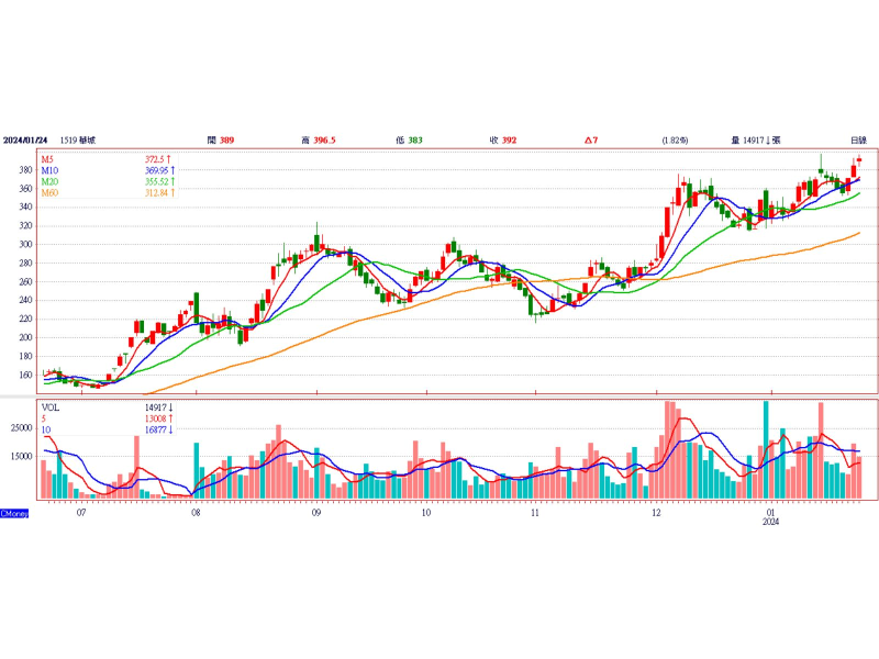 專注變壓器廠華城先前受惠台電強韌電網計畫十年投入5,645億元預算,現今再因美商務部宣布課徵韓廠反傾銷稅,估有高達千億美元變壓器需求,大幅轉單台廠效應下,雙箭齊發,個股股價已突破前波高點站上390元,理周投研部表示,美國訂單的挹注,華城隨著產能增加毛利率可望進一步提升,估每股稅後淨利( EPS)調高5。5%至14。6元,給予30倍本益比,目標價上看438元。