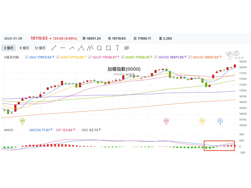 現在跟 2022 年有哪裡不一樣呢?先不論消息面如戰爭、通膨與聯準會升息等因素。以技術面來看,上週加權指數才化解了 MACD 翻落零軸的中空危機,只要 1/31 月線能收在 17,422 以上收紅,就能持續多方走勢,要抱股過年也比較放心。
