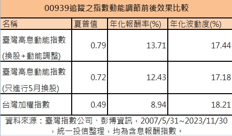 根據歷史回測,假設臺灣高息動能指數每年指數調整,只有5月精選40檔優質高息股,搶收6至9月的台股股息發放,沒有9月和1月的動能調節權重,指數夏普值達到0.72,遠高於加權指數的0.49。但若是臺灣高息動能指數在5月的成分股調整以外,增添動能調節。除權息淡季時,指數目標轉向追求資本利得,在 9月及1月用夏普值調節權重,加碼強勢股並減碼弱勢股。00939追蹤之指數的夏普值可以進一步提升至0.79,年化報酬率也從12.43%拉高至13.71%,遠高於加權指數的8.94%。