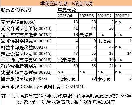 高股息ETF堪稱台股人氣王,擁有超高人氣,但投資人除了股息追高之餘,也要留意填息能力,以免賺了股息卻賠了價差。觀察市面上10檔季配型高股息ETF,可以發現共有7檔已完成去年第四季配息的填息,包括凱基優選高股息30(00915)、群益台灣精選高息(00919)、元大高股息(0056)、元大台灣高息低波(00713)、復華富時高息低波(00731)、群益半導體收益(00927)、富邦特選高股息30(00900)。