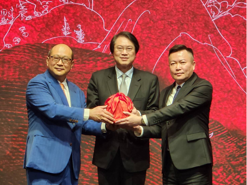 內政部部長林右昌(中)擔任監交人,將印信由第5屆理事長謝坤成(左)手中,移交給新任第6屆理事長戴嘉聖(右)。