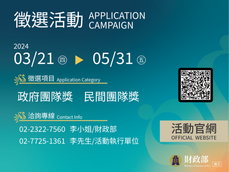 財政部提醒,第22屆金擘獎申請文件須於112年5月31日下午5點前郵寄或專人送達財政部(送達地址:臺北市文山區羅斯福路6段142巷1號13樓)。請申請團隊掌握時效,積極參獎;徵件、徵選說明會及觀摩活動等詳情請參閱財政部民間參與公共建設資訊網http://ppp.mof.gov.tw/最新消息。