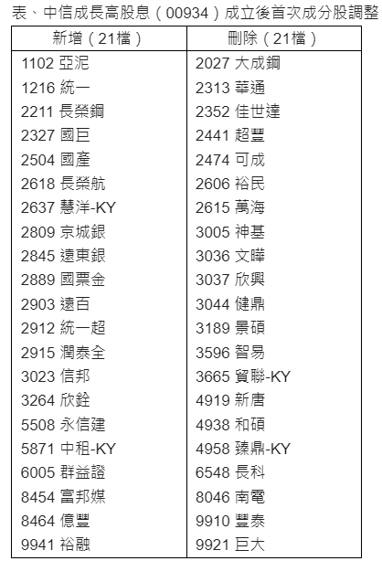 中信成長高股息(00934)經理人張圭慧表示,中信成長高股息(00934)追蹤臺灣優選高股息指數,每年隨台股除權息淡旺季共調整2次成分股,今年4月迎來第一次成分股調整,新增國產、統一超、群益證等21檔,剔除萬海、可成、南電等21檔。(請詳以下表格)