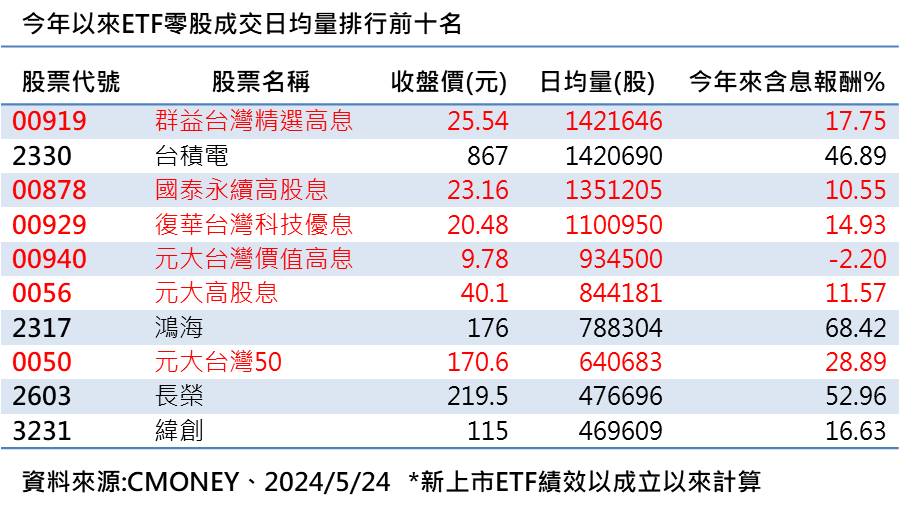 近期台股頻創新高,「存股」、「存ETF」的小資存股熱度不減,觀察今年以來台股零股交易情況,其中擁有穩定高息配息政策的00919群益台灣精選高息ETF最受小資族投資人青睞,今年來零股交易日均量142.1萬股最具人氣,勝過台積電、鴻海、長榮、緯創,成為台股小資最佳人氣王。進一步觀察前十大排行中,台股ETF就佔了6席,其中高股息ETF佔了5席,顯示出台股高息ETF的存股價值持續受投資人青睞。