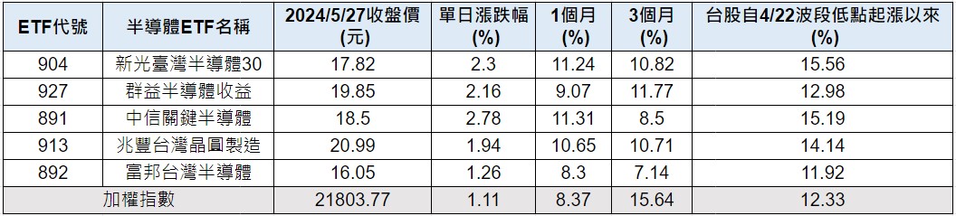 根據CMoney統計,本波台股從低點4/22一路驚驚漲以來,國內5檔半導體ETF漲幅更是凌駕大盤,表現最好的是新光臺灣半導體30 ETF (00904),從4/22隨大盤波段低點一路起漲,截至5/27止,新光00904含息報酬率高達15.56%,超過同期間的大盤的12.33%,漲幅居次是中信關鍵半導體ETF(00891),同期間含息報酬率也達15.19%,同樣兆豐台灣晶圓製造ETF(00913)在該期間也上漲約14.14%,至於群益半導體收盤ETF(00927)也有12.98%表現,同樣領先大盤。