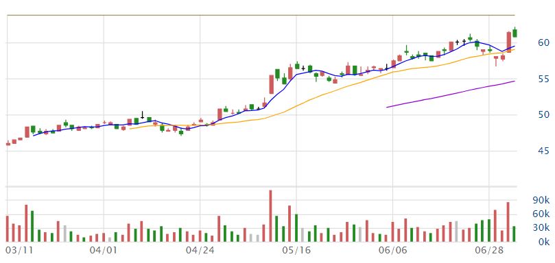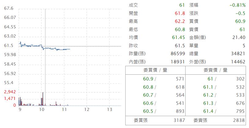 國泰金今日開盤價61.8元,盤中一度觸及62.2元,隨後空方力道突增,股價一路震盪向下,目前跌至61.0元。