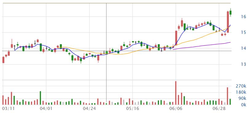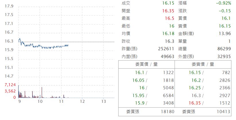 開發金以16.35元開盤,情況與國泰金類似,開盤後股價曾一度上漲至16.50元,可惜漲勢後繼無力,股價一路下跌,最低跌至16.00元,不過目前隱有回升趨勢,目前股價16.15元。