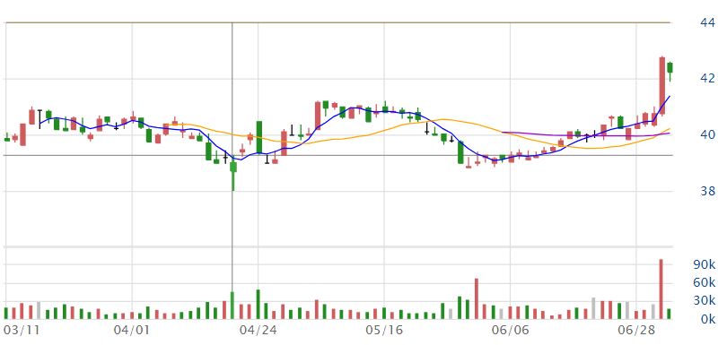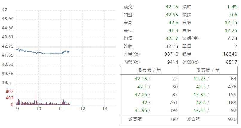 兆豐金今日開盤價42.55元,目前股價42.15元維持震盪,跌幅1.40%。