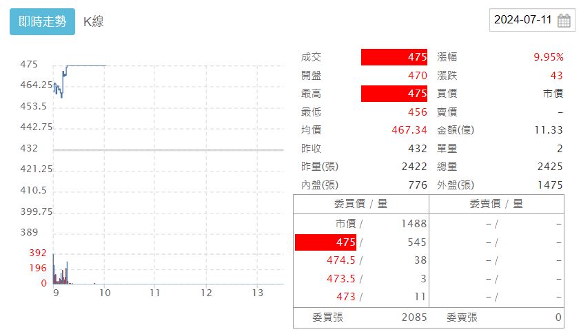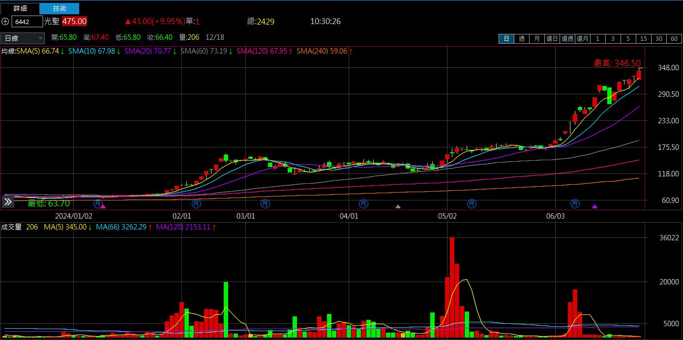 光通訊股光聖(6442)今(11)日跳空開高,開盤價470.0元,盤中雖一度跌至456.0元,最終還是帶量攻上漲停板,漲停價475.0元,漲幅9.95%,目前線型屬多頭趨勢。從今年初1月2號收盤價70.1元來算,光聖上半年漲幅高達677.6%,漲勢洶洶。