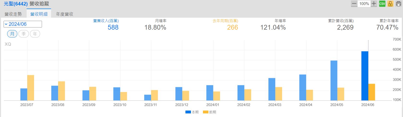 光聖6月最新營收為5.8億元,創40個月新高,月增18.8%,連續4個月成長,年增122.26%,連續7個月成長;上半年累計營收為22.6億元,年增70.47%。最新EPS為1.72元,季增340.17%,創6季新高,近四季EPS為3.75元。