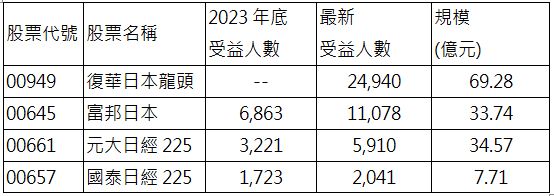 ▲ 日股ETF受益人數及規模統計(資料來源:集保結算所、證交所,最新受益人數統計至2024/7/5,規模統計至2024/7/11)