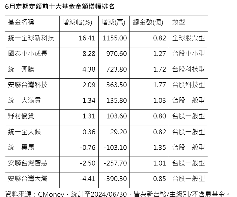 根據CMoney數據,6月定期定額扣款排名前十大基金,總扣款金額增加2730萬至11.44億元,有超過4成的增額,是由統一全球新科技基金貢獻。除此之外,榜上有6檔台股基金定期定額金額較上月成長,且半數為統一投信基金。統一奔騰基金6月定期定額金額增加723.8萬至1.72億,為台股科技型基金增額冠軍。統一大滿貫及統一全天候基金,定期定額金額也分別成長至1.03及0.82億元。