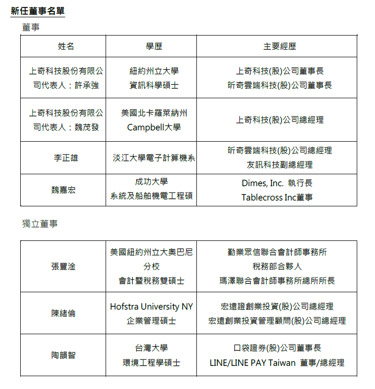 本次改選延攬各領域傑出人士,除了內部董事外,外部董事與獨立董事亦將扮演未來領導公司和業務發展的角色。張豐淦獨立董事擁有26年以上之美國與台灣會計及稅務實務經驗,專精會計及稅務風險評估;陳緒倫獨立董事在上市承銷與投資領域經驗豐富,擅於投資與國際化戰略分析;陶韻智獨立董事具外商顧問與創業家的身份,帶領新創團隊在台灣市場迅速擴展並於紐