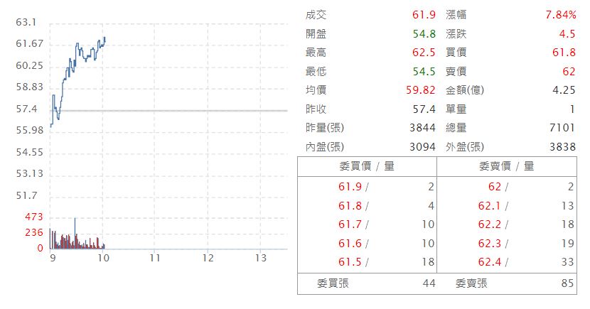 台北國際自動化工業大展將在南港展覽館隆重舉行,機器人概念股輪動,和椿科技(6215)今(8)日漲勢強勁,早盤以54.8元開出,股價一路震盪向上,拉出長紅K,目前暫報61.6元,漲幅7.32%,隱有攻上漲停趨勢,截至上午9點58分成交量為6884張。