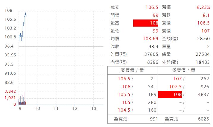 光電股亞光(3019)延續前幾日漲勢,早盤開在99.0元,盤中漲勢強勁,股價最高觸及108.0元,目前股價回檔修正,暫報106.0元,漲幅7.72%,蓄力攻漲停,截至上午9點30分成交量為29379張,多頭趨勢明顯。