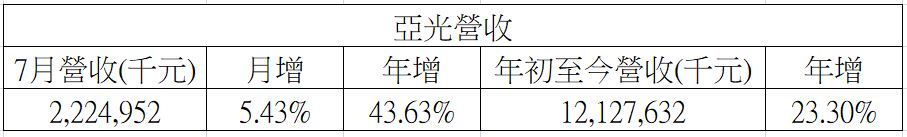 亞光7月最新營收為22.2億元,創40個月新高,月增5.43%,連續3個月成長,年增43.63%,連續5個月成長;今年1到7月累計營收為121.2億元,年增23.30%。