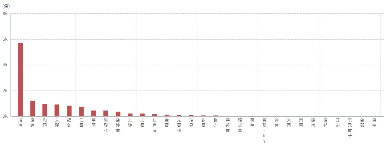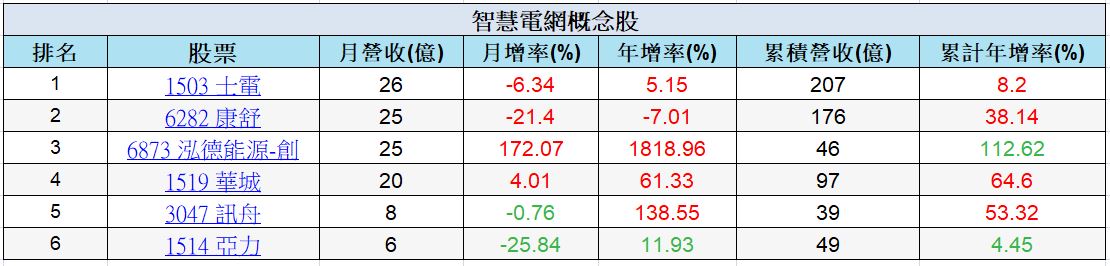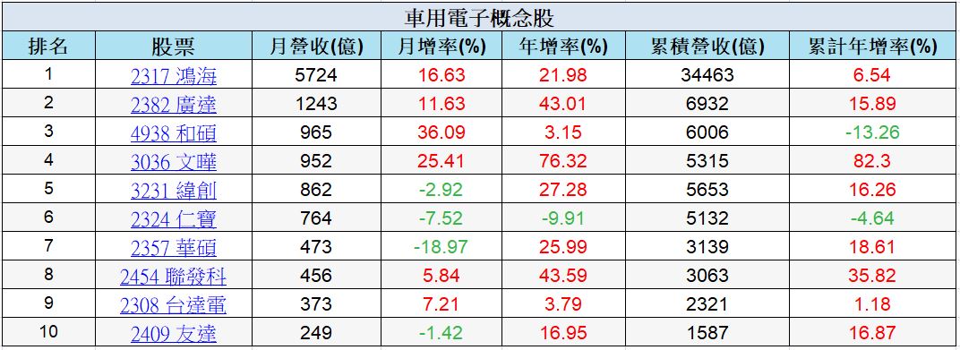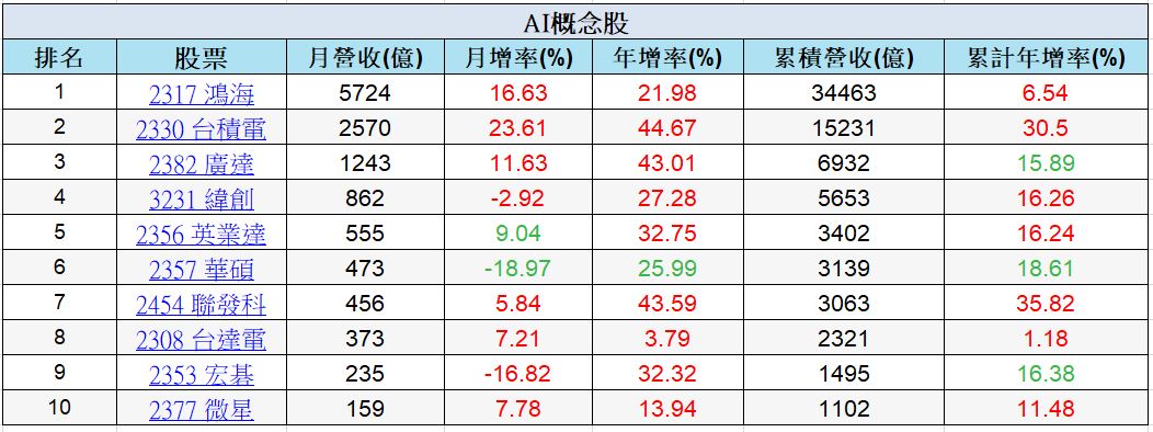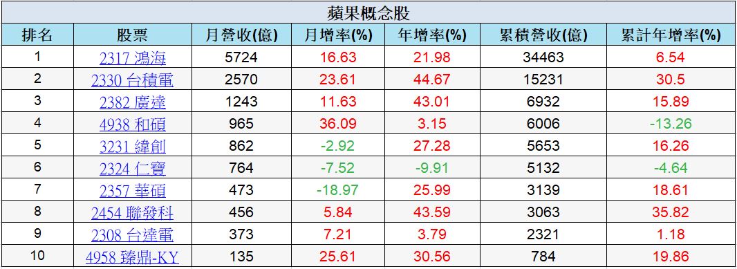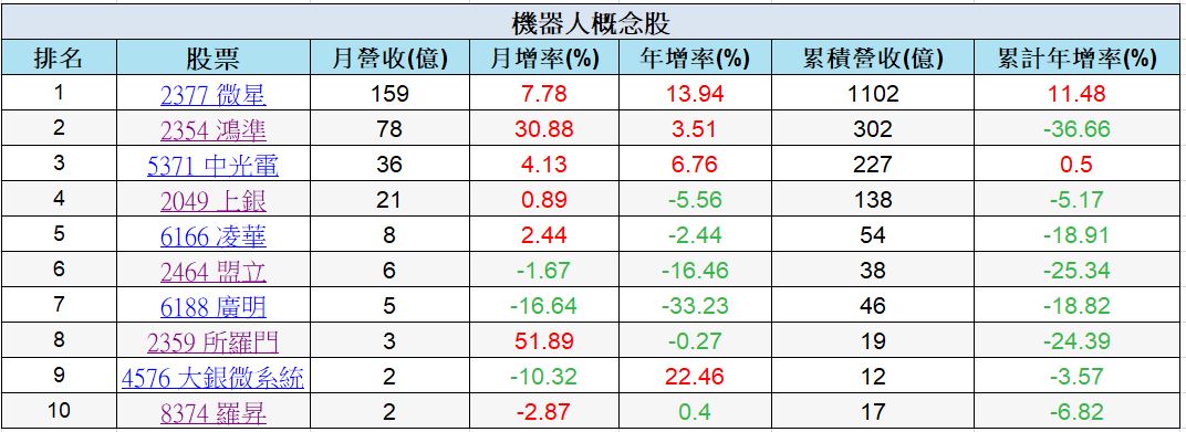 熱門概念股(蘋果、機器人、智慧電網、車用電子、AI)7月營收排行前十