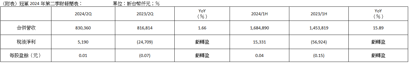 磁磚業領導品牌冠軍建材股份有限公司(1806)公布2024年第二季合併營收為8.3億元,年增1.66%,稅後淨利519萬元,每股稅後盈餘(EPS)達0.01元,皆較去年同期由虧轉盈,並創近六年同期新高。累計2024年上半年合併營收達16.85億元,年增16%,稅後淨利1,533萬元,每股稅後盈餘(EPS)0.04元,亦較去年同期繳出虧轉盈,並優於2023年全年獲利表現。