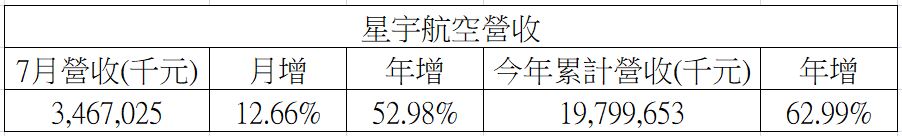 7月營收34.67億元,續創歷史新高,月增13%,年增53%,連續11個月成長,受惠於暑假旺季,旅運市場蓬勃發展,載客人數與票價均顯著成長,帶動營收強勁提升。今年1到7月累計營收為197.9億元,年增62.99%。