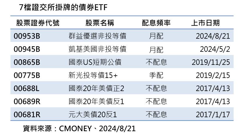 債券ETF投資熱,臺灣證交所債券ETF掛牌數再添生力軍,由群益投信募集發行之「群益優選收益非投資等級債券ETF基金 (簡稱群益優選非投等債,證券代碼00953B)」在今(8/21)成功掛牌上市交易,成為第7檔證交所掛牌債券ETF。進一步觀察,加上00953B目前市場上共有92檔債券ETF,其中85檔在櫃買中心交易,證交所上市的債券ETF僅7檔。進一步觀察債券ETF歷年發展,從2017年的14檔至今92檔,受益人數也從3467人成長至最新1812415人,顯示出債券ETF越來越受一般投資人青睞。
