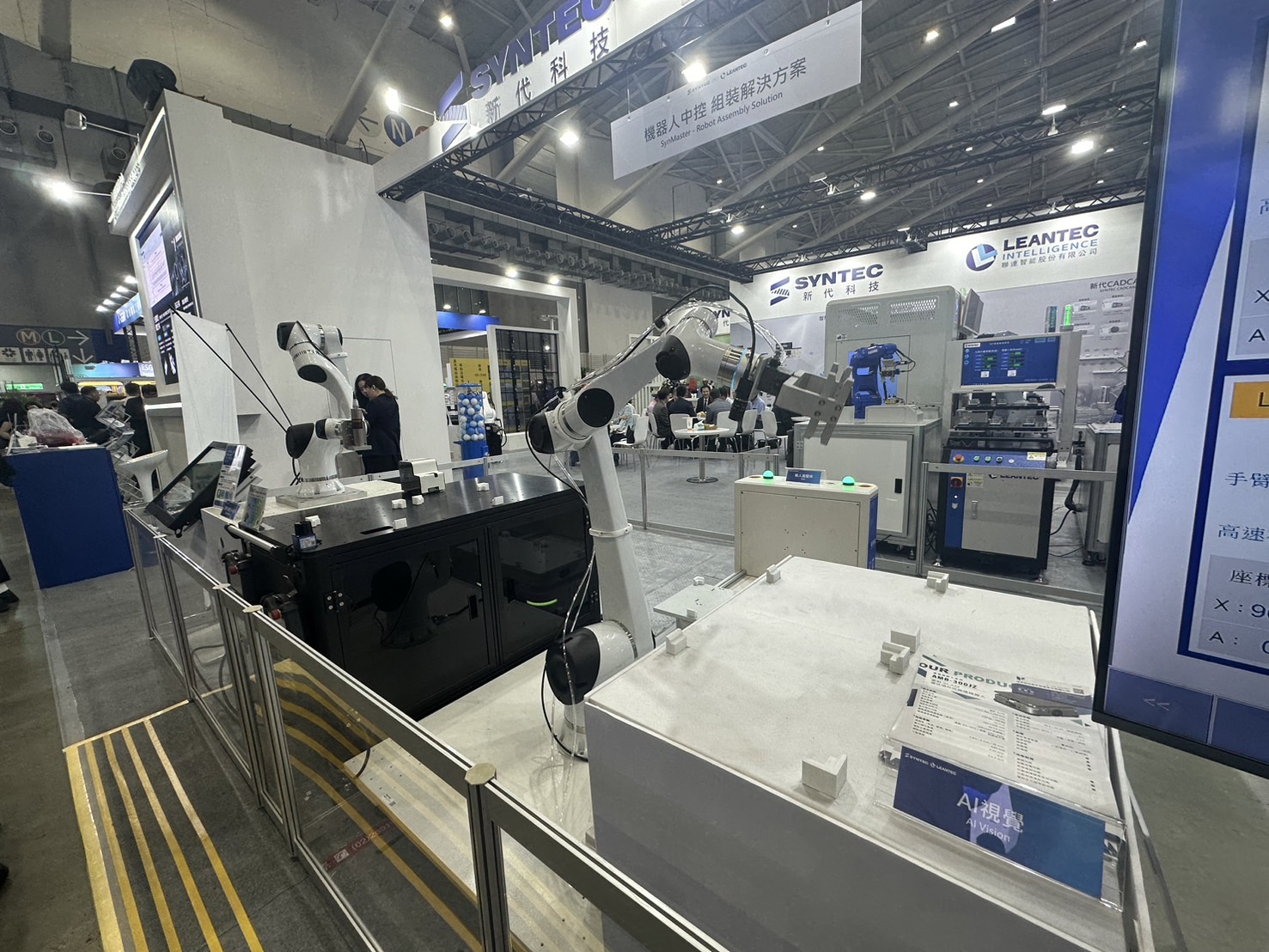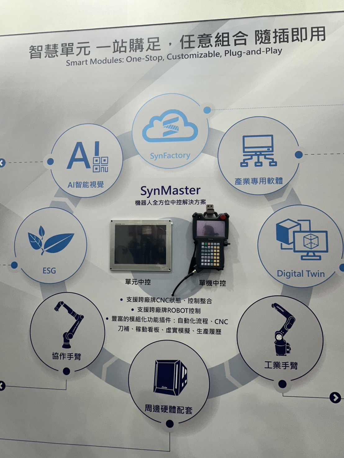 新代科技(7750)本次自動化展展出多台機械手臂,而新代的優勢在於,他們擁有機械手臂控制器的技術,現場展出的SynMaster機器人全方位解決方案,共有兩種控制器,不僅支援跨廠牌CNC狀態、控制整合、跨廠牌ROBOT控制,也具有豐富的模組化功能插件(自動化流程、CNC刀補、稼動看板、虛實模擬、生產履歷)。SynMaster可以運用於機械協作手臂、ESG能耗看板等。