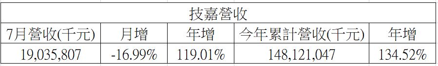 技嘉7月最新營收為190.3億元,月增-16.99%,年增119.01%,連續 15 個月成長;今年1到7月累計營收為1481.2億元,年增134.52%。