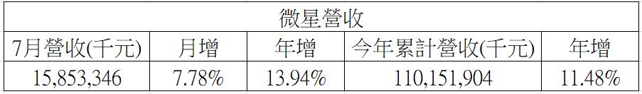 7月最新營收為158.5億元,月增7.78%,年增13.94%,連續7個月成長;今年1到7月累計營收為1101.5億元,年增11.48%。
