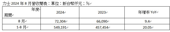 專業MOSFET設計廠商力士科技(4923)今日公告2024年8月合併營收為新台幣7,230萬元,受惠客戶既有產品庫存水位下降,以及新技術新訂單挹注下,8月單月營收為今年次高表現,年增9.4%,累計前8月合併營收為5.49億元,較去年同期增加20.05%。