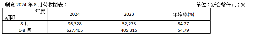 樂意傳播股份有限公司(7584)今日公告8月份合併營收為新台幣9,633萬元,較去年同期成長84.27%;累計1-8月營收6.27億元,較去年同期成長54.79%,創歷史同期新高。