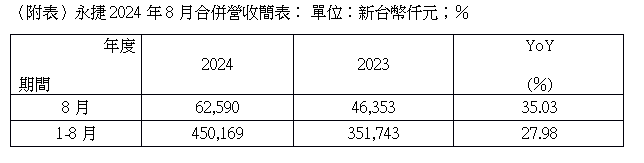 永捷表示,雖目前進入傳統PU合成皮樹脂產業淡季,主要客戶拉貨力道回歸正常水準,是永捷8月營收站穩6,259萬元的原因,然從研發與訂單來看,顯示PU環保型水性樹脂產品包括高固型、低溶劑型、水性等的終端需求應用持續擴大,尤其是國際知名運動品牌廠商、國際知名半導體大廠等,在追求ESG永續發展下,相關供應鏈更積極深化在PU環保型水性樹脂等應用的技術開發上,為永捷創造良好的業務接單空間。