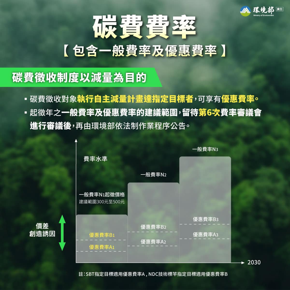 環境部氣候變遷署副署長黃偉鳴表示,目前已確定一般費率的起徵價在每噸300至500元之間,分階段調升至2030年後費率為1200至1800元,並計劃每2至3年檢討、調整。