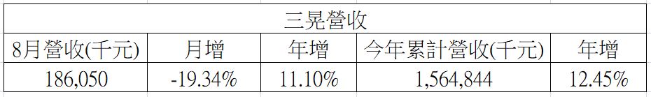 8月最新營收為1.8億元,月增-19.34%,年增11.1%,連續3個月成長;今年1到8月累計營收為15.6億元,年增12.45%。