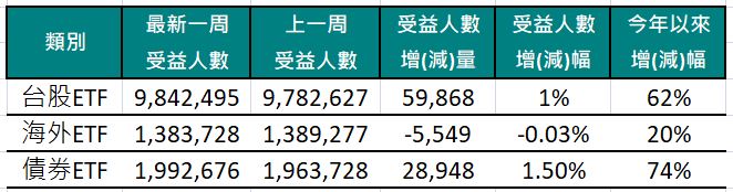美國聯準會確定啟動降息循環,市場不確定因素消除,投資人持續買進ETF。根據最新一周集保戶股權分散統計資料顯示,台股ETF受益人數達到984.2萬人,續創新高,持續往千萬人邁進;較上一周新增5.9萬人,增幅1%。而債券ETF受惠美國降息利多,長線收益可期,受益人數來到199.2萬人,逼近200萬大關,同樣續創歷史新高,周增2.9萬人,增幅1.5%。海外ETF受益人數138.3萬人,周減5,549人,表現持平。