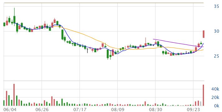 新興今日跳空開高,開盤價28.70元,盤中震盪向上,順利亮燈漲停,漲停價30.15元,漲幅9.84%,今日成交量為50506張,幾乎較前一日暴增五倍,目前仍有近3萬張買單排隊等候中。