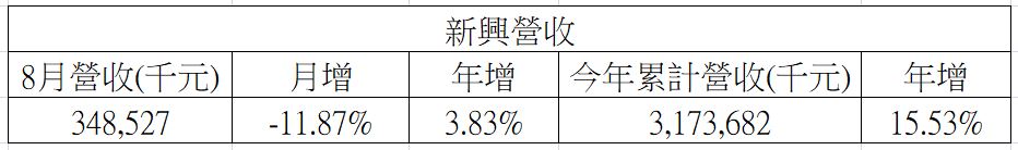 8月最新營收為3.4億元,月增-11.87%,年增3.83%,連續8個月成長;今年1到8月累計營收為31.7億元,年增15.53%。最新EPS為1.2元,季增100.0%,連續3季成長,創40季新高,近四季EPS為2.17元。
