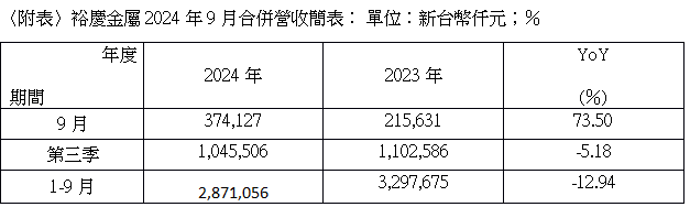 裕慶金屬股份有限公司(6957)於今日公布2024年9月合併營收達3.74億元,月增27.01%、年增73.5%,創歷年同期次高。累計2024年第三季合併營收達10.46億元,季增24.24%。累計2024年1至9月合併營收達28.71億元。