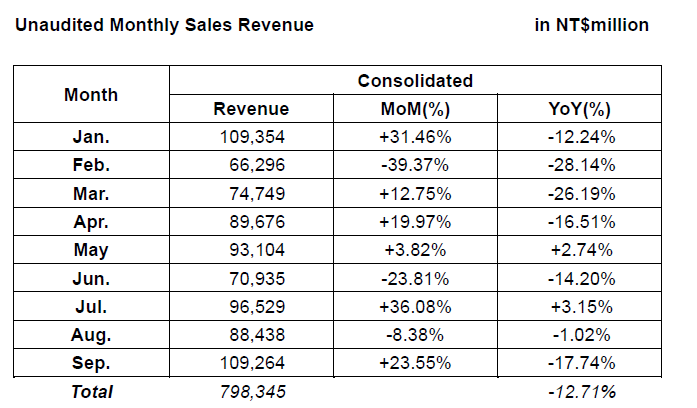 和碩(4938)今日最新公告9月業績,9月營收1092.64億,月增23.55%、年減17.74%、累計今年1-9月營收為7983.45億,年減12.71%。