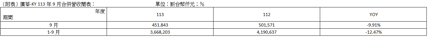 觀察近期中國政府為解決經濟問題,在有效落實存量政策的同時,也針對「加大宏觀政策逆週期調節」、「擴大國內有效需求」、「加大助企幫扶力度」、「推動房地產市場止跌回穩」、「提振資本市場」等5個方面,加強推出一系列增量政策,期盼推動整體經濟回溫,加上推出汽車「以舊換新」政策、加倍補助換新能源車等的政策奏效,以及新車上市與秋季車展啟動等,助力中國新車銷售量有逐步回升。展望113年第四季,廣華-KY維持審慎樂觀看法。公司期待隨著整體新車銷售市場健康成長,將推進主要客戶保持穩定的拉貨需求,也看好新產品、新訂單陸續開花結果,推升廣華未來營運表現正向發展。