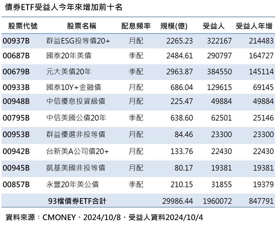 降息循環啟動、債市多頭將起,債券ETF也受到投資人追捧青睞,受益人數持續創高,根據集保所公布的最新ETF受益人數統計數據顯示,截至10月4日止,整體債券ETF受益人數突破196萬人,來到1960072人,今年來共增加847791人;以產品類型來看,仍以長天期債券ETF最受投資人關注,而若進一步細究各檔債券ETF受益人數增減狀況,以00937B群益ESG投等債20+ETF人氣最旺,今年來大增214483人,整體受益人數來到322167人,持續坐穩受益人數最多的投等債券ETF寶座。