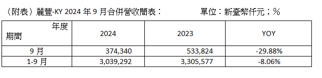 麗豐股份有限公司〈4137〉於今日公佈2024年9月合併營收3.74億元,較8月營收3.29億元增加約13.6%,連續三個月環比正成長;累計2024年1至9月合併營收30.39億元,則較去年同期減少8%。麗豐-KY表示,近期因中國大陸的社會經濟刺激方案推出,民生消費及年底景氣皆有望反彈回溫,為使集團未來發展能更上層樓,務必將眼光放遠,麗豐-KY今、明二年在營運上仍著重於品牌宣傳、通路經營及新品開發等重點,在韜光養晦的同時靜待宏觀回暖,營運表現先蹲後跳、再創佳績。