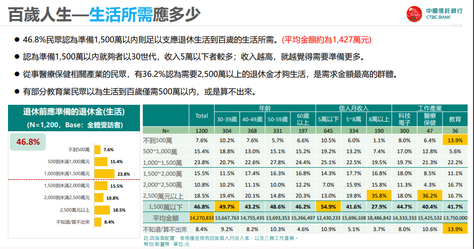 而要能支撐百歲人生理想的退休生活,需應多少錢呢?46.8%民眾認為準備1,500萬以內則足以支應退休生活到百歲的生活所需,而平均金額約為1,427萬元;認為準備1,500萬以內就夠者以30世代,收入5萬以下者較多;收入越高,就越覺得需要準備更多。